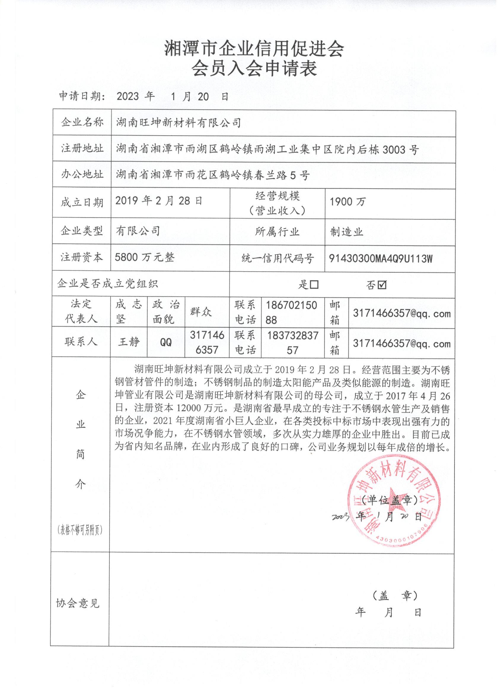 | 名稱: 湖南旺坤新材料有限公司 | 登記證號: 91430300MA4Q9U113W | 法定代表人: 成志堅(jiān) | |||||||||