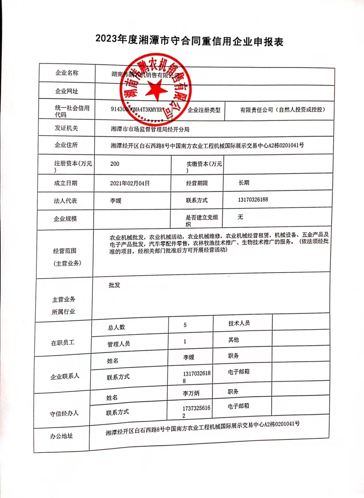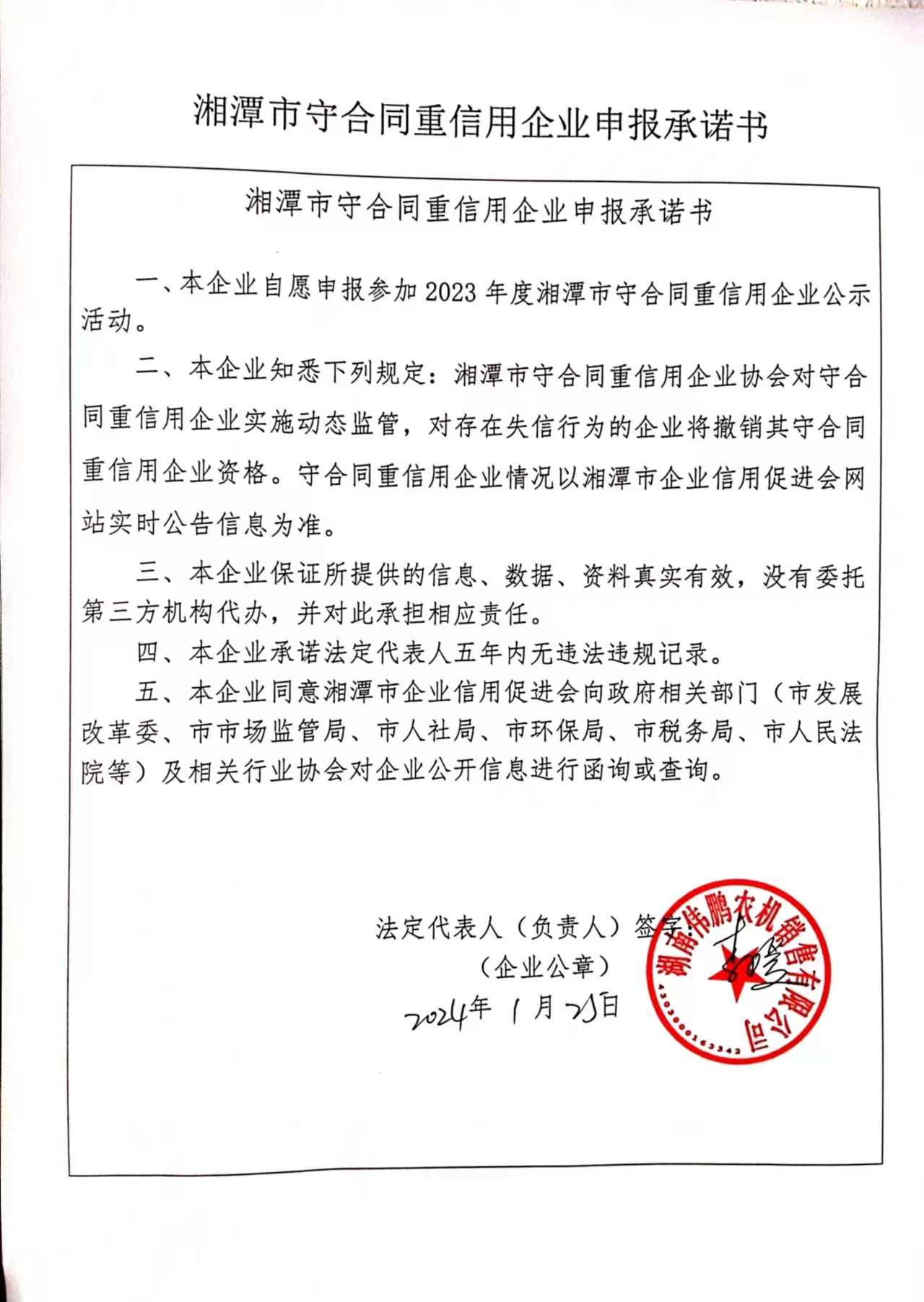 本企業(yè)根據《湘潭市守合同重信用企業(yè)申報規(guī)定》等編制 2023 年度企業(yè)信用報告書,并保證本報告書內容真實、準確、完整。