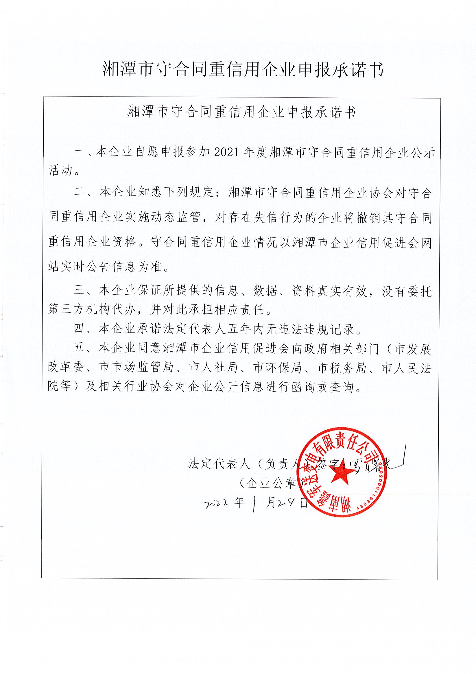 本企業(yè)根據(jù)《湘潭市守合同重信用企業(yè)申報(bào)規(guī)定》等編制 2021 年度企業(yè)信用報(bào)告書,并保證本報(bào)告書內(nèi)容真實(shí)、準(zhǔn)確、完整。